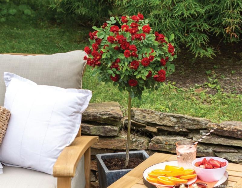Dark red flowers cover the top of this compact plant with a big impact. SunblazeĀ® Roses are easy to grow, miniature roses. Small rosettes of layered red petals cover dark green foliage. Get everything you love about a rose in the form of a tree with this 15 inch wide bush on an 18 inch tall standard. Enjoy in a container on the patio and then move to the garden. SunblazeĀ® Roses grow best in full sun and is hardy to Zone 5.