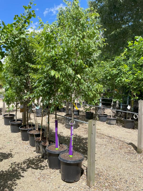 Zelkova serrata Village Green™ is a deciduous tree valued for its attractive form and landscape appeal. It typically reaches a mature height of 50 to 80 feet with a spread of 40 to 60 feet, forming a broad, vase-shaped canopy. The tree's dark green, serrated leaves turn a rich bronze or burgundy color in the fall, providing a stunning autumn display. Village Green™ thrives in full sun to partial shade, displaying its best growth and fall coloration in locations with ample sunlight. This adaptable and resilient tree is well-suited for a variety of landscaping applications, offering shade, visual interest, and a touch of elegance to outdoor spaces. Hardy to Zone 5.