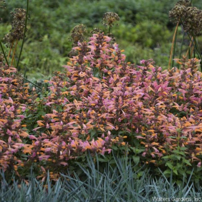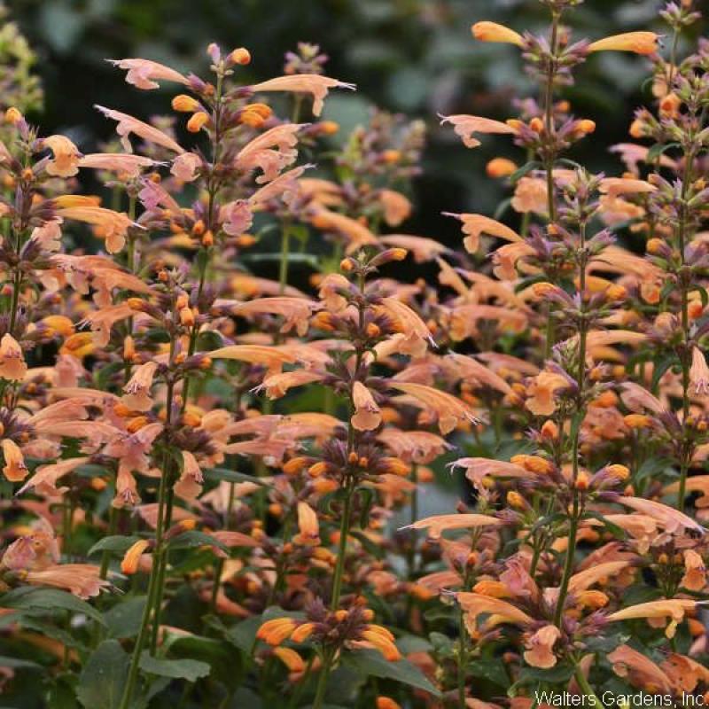(Anise Hyssop) light peach to dusky orange flowers have rose calyxes; aromatic green foliage; 16-18 inches; full sun; Zone 5