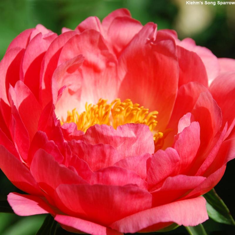 Peony 'Coral Sunset' is a customer favorite, with intense sunset coral, semi-double blooms with rose overtones and a fluffy center of deep yellow stamens. Flowers are lightly fragrant and long lasting in fresh bouquets.