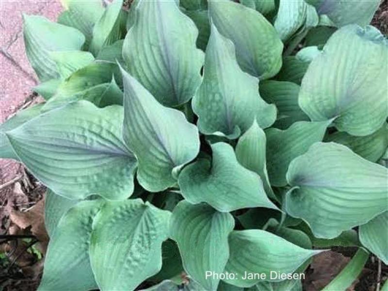 Pointed, blue-green leaves with gently wavy margins are blushed with purple in the centers shortly after emerging. The leaves lose the blush in the heat of summer and are an attractive blue-green again. Leaves are held on red petioles. Grows around 16" tall and 36" wide. Lavender flowers appear in summer.