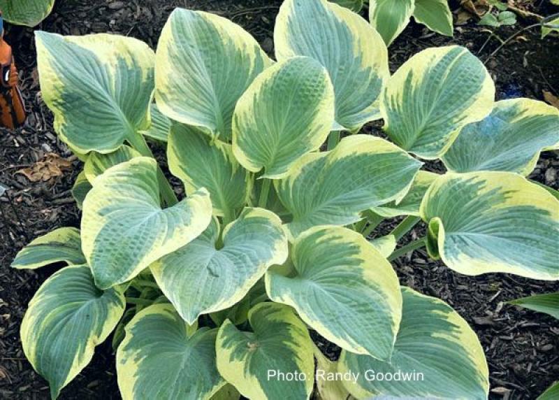 From Randy Goodwin comes this striking hosta, a seedling of H. montana. The pointed leaves are blue-green with yellow margins that cut into the centers. The margins turn to white in the summer as the centers turn more green. It grows around 15" tall and 30" wide. Near white flowers in early summer.