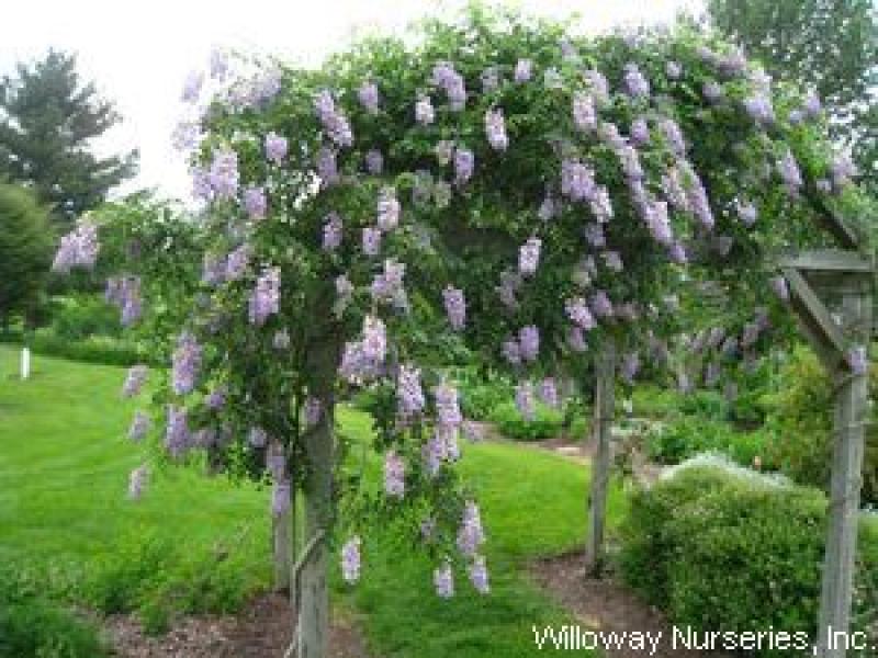 (Wisteria) extremely fast growing and blooms up to 3 times a year if grown in full sun; beautiful lavender-blue flowers; very hardy; 15 feet tall; Zone 3