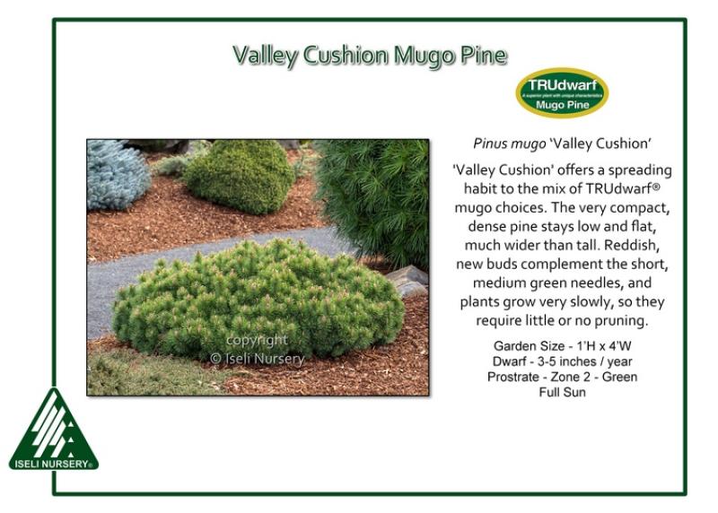 Pinus mugo ‘Valley Cushion’ offers a spreading habit to the mix of TRUdwarf® mugo choices. The very compact, dense pine stays low and flat, much wider than tall. Reddish, new buds complement the short, medium green needles, and plants grow very slowly, so they require little or no pruning. Selected at the North Willamette Research Station in Oregon’s famed Willamette Valley, this cultivar is extremely hardy and an excellent choice for cold parts of the country. Garden size is 1' tall and 4' wide. Full sun. Hardy to Zone 2.