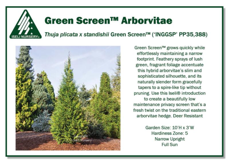 Green Screen™ grows quickly while effortlessly maintaining a narrow footprint. Feathery sprays of lush green, fragrant foliage accentuate this hybrid arborvitae’s slim and sophisticated silhouette, and its naturally slender form gracefully tapers to a spire-like tip without pruning. Use this Iseli® introduction to create a beautifully low maintenance privacy screen that’s deer resistant. Green Screen is a fresh twist on the traditional eastern arborvitae hedge. Grows 10' tall and 3' wide and is hardy to Zone 5.