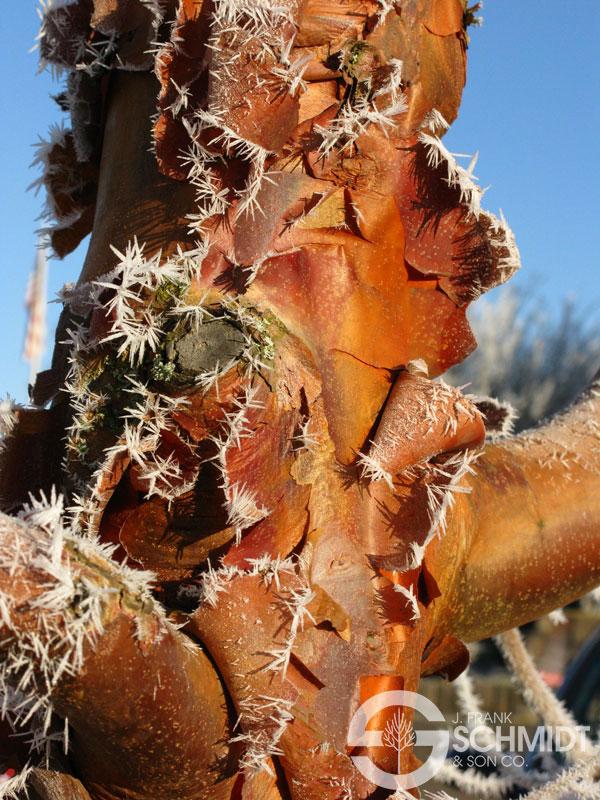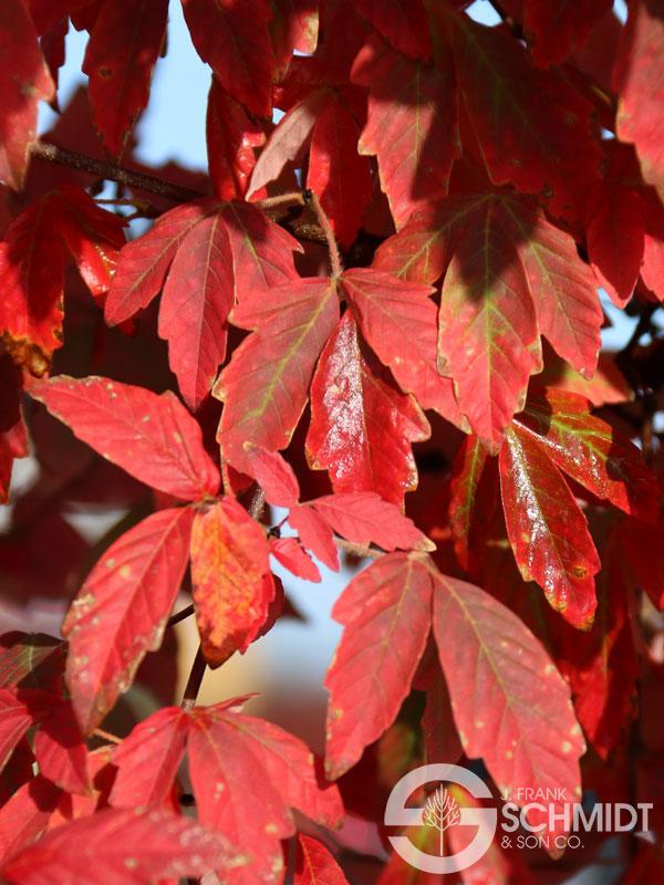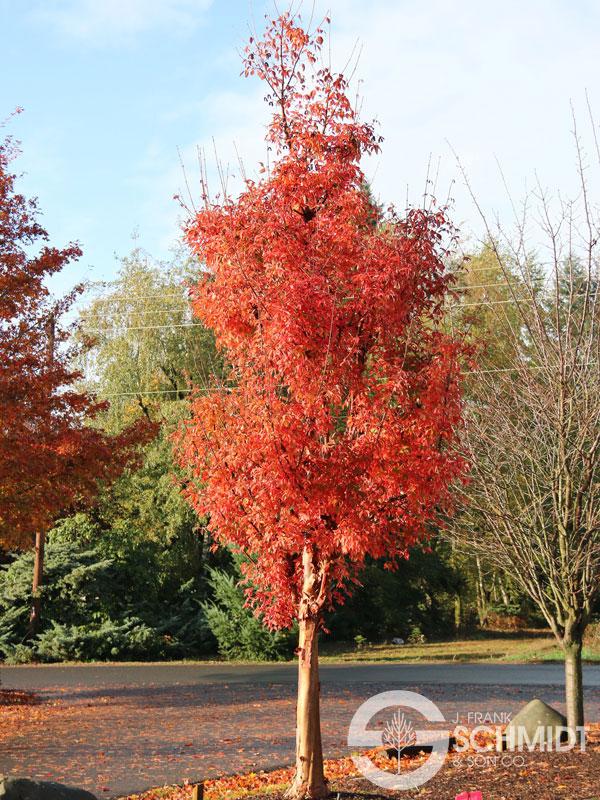 Superior branch structure, upright and uniform shape, predictable performance and speedy growth are among the improved attributes of this Paperbark Maple cultivar. Bark coloration and exfoliating character are outstanding, as is the quality of dark green foliage that turns brilliant red in autumn. Grows in sun to part shade, 25' tall and 18' wide. Hardy to Zone 5.