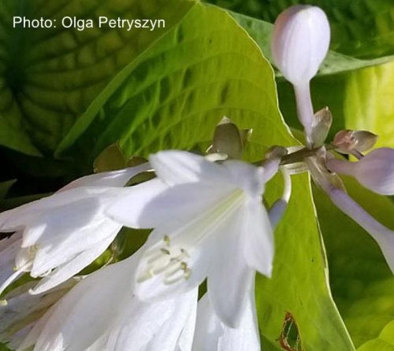 Another great large hosta from Olga Petryszyn. Golden yellow leaves are tightly packed, yet neatly arranged, forming an impressive clump. Good substance and corrugation. Grows around 26" tall and 43" wide. Near white flowers in summer.