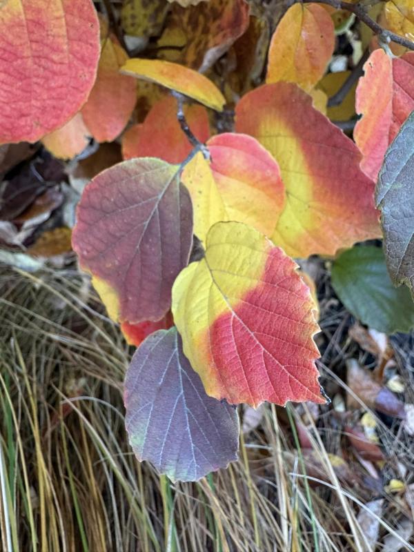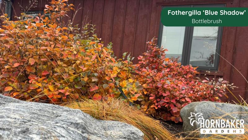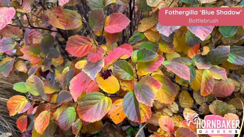 Like all fothergilla, this one is adorned with honey-scented, bottlebrush flowers in early spring before it leafs out. But what sets this outstanding plant apart from the rest is its colorful, silvery blue leaves. In autumn, the blue foliage transforms to shades of rich red, orange and yellow, with multiple shades per leaf in our experience. We have several of these planted here near the barn. 'Blue Shadow' grows fairly slowly, eventually getting 4-6' tall with a spread of 4-5'. Good in sun to part shade. Hardy to Zone 4.
