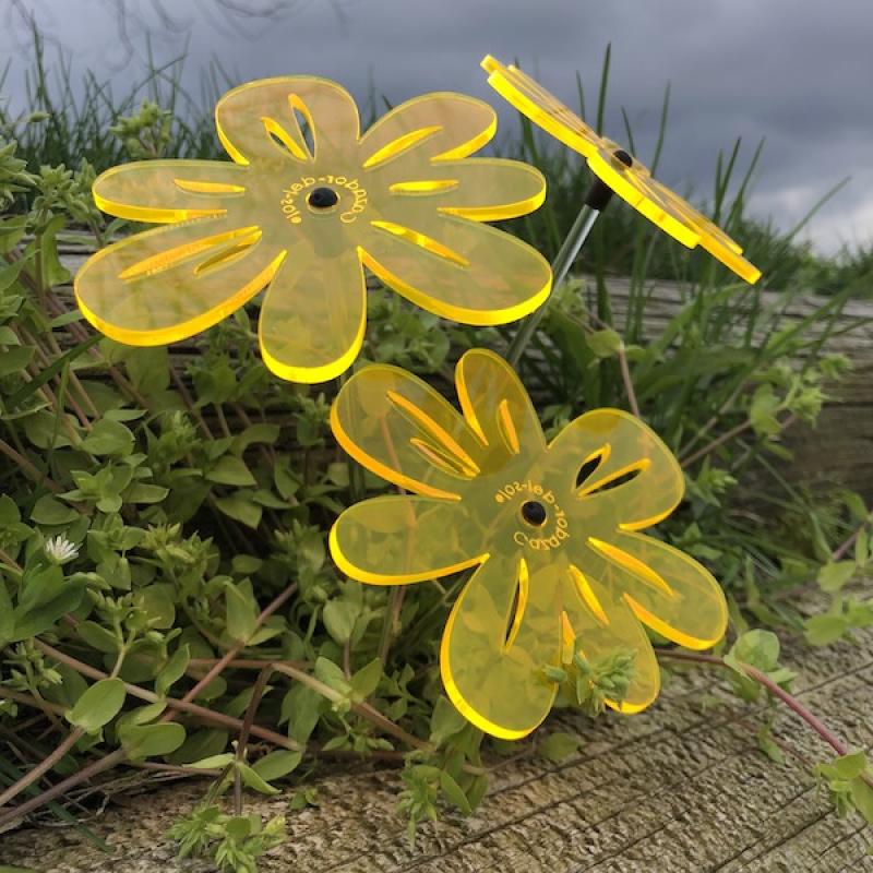 Flat, yellow, flower-shaped suncatcher. 3.2" flower on a 17" clear stem.