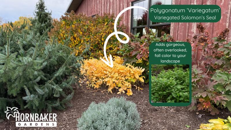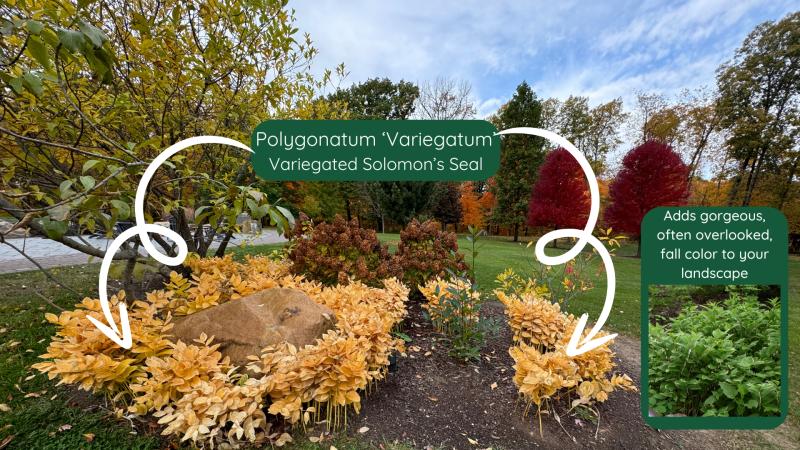 (Variegated Solomon's Seal) colonizing plant for part to full shade; white edged leaves on arching stems 2 feet tall; pendulous white flowers; good cut flower; Zone 3