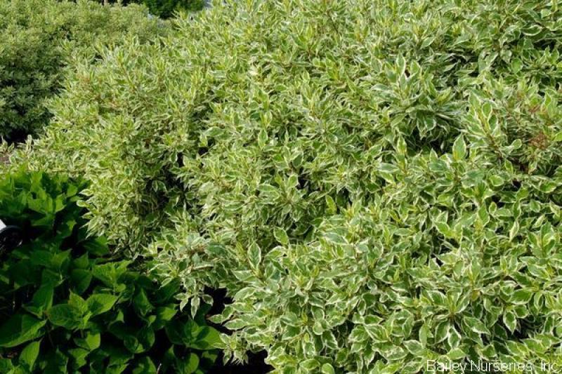 This compact selection of variegated dogwood provides beautiful variegated foliage in summer and attractive blood-red twigs in winter. It grows 5-6' tall and wide in sun to part shade. Hardy to Zone 3.