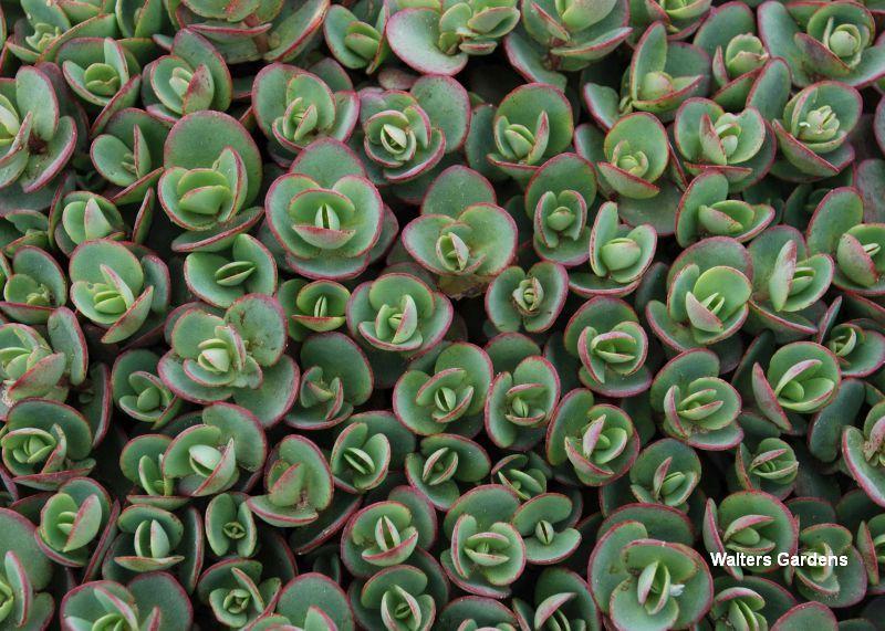 (Stonecrop) apple green leaves edged in cherry red form a tight, weed-suppressing, low growing carpet of foliage; soft pink flowers in late summer; 4-6 inches; full sun; Zone 4