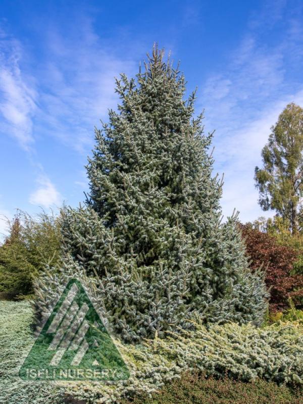 This Serbian Spruce has classic two-toned needles, green with silvery-blue undersides. The branches sweep upward, exposing the undersides of the needles and reflecting against the top side to display a bright silver-blue against a green background. Plant with enough space around it so that it can develop into an attractive and colorful anchor in the garden. Full sun and well-drained soil is best. Garden size is 25' tall and 15' wide. Hardy to Zone 4.