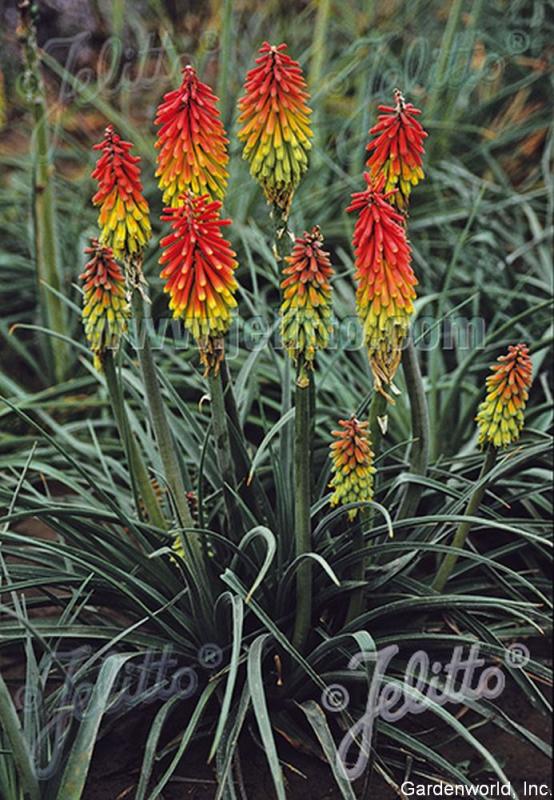 (Red Hot Poker) a shorter variety with coral red and yellow flower spikes; blue-green foliage; full sun; 20 inches; Zone 4