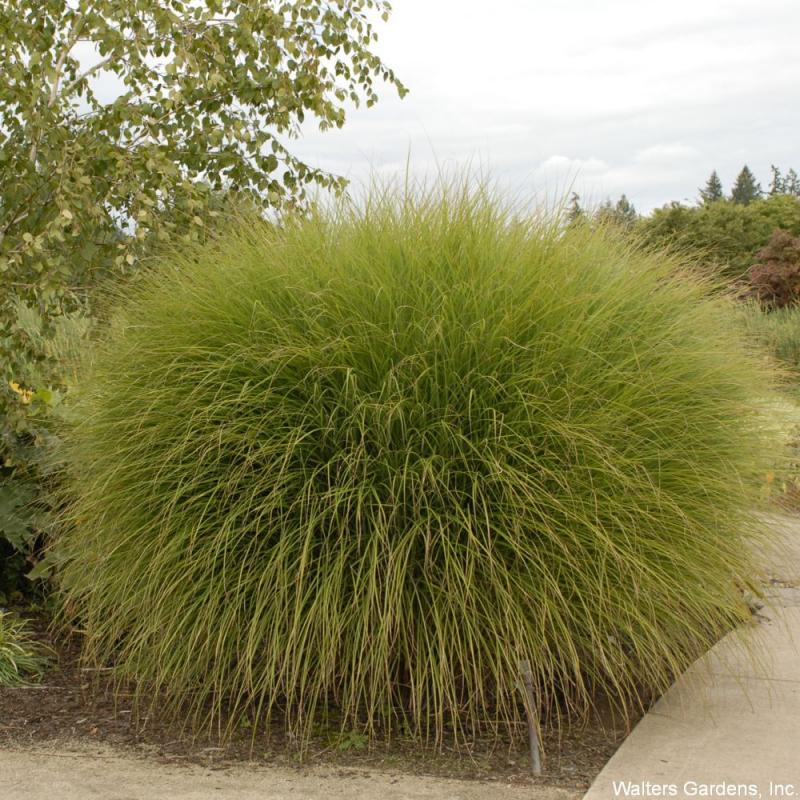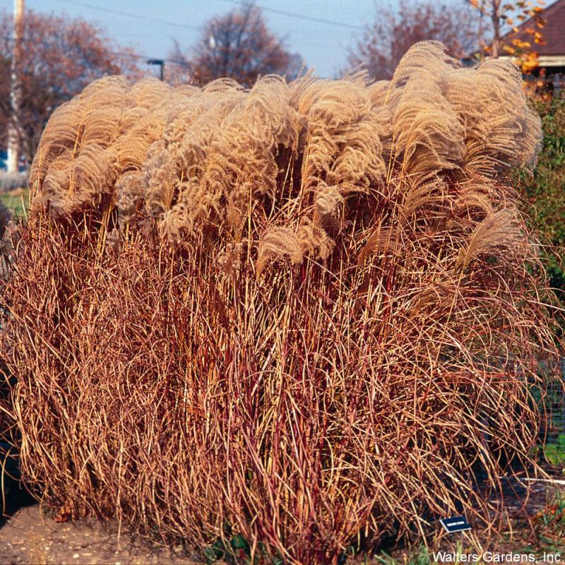 (Maiden Grass) one of the oldest cultivars, with fine textured foliage and showy plumes in late September; 5-6' tall; Zone 5