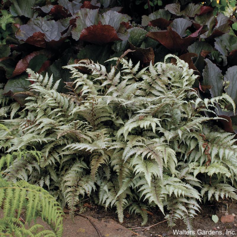 (Japanese Painted Fern) a.k.a 'Metallicum'; cute and colorful, with soft gray, red and green flushed fronds; light to moderate shade; 12-18 inches; Zone 3