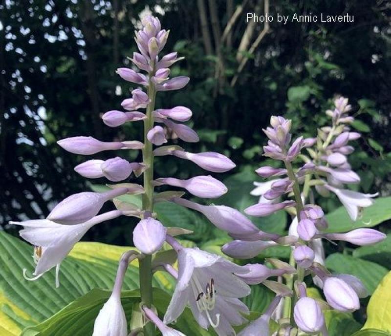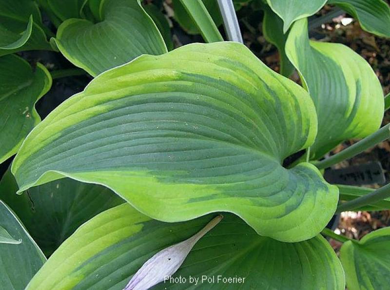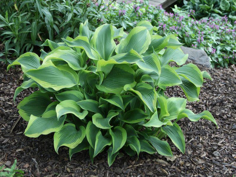 This sport of 'Abba Dabba Do' has a significantly wider edge than its parent, making it a showier specimen in the landscape. The slightly rippled leaves are dark green with golden yellow margins. The color of the margins are typically brighter with more sunlight. Pale lavender flowers appear above the foliage in midsummer. Forms a majestic specimen with age. Can grow 30” tall and 70” wide.