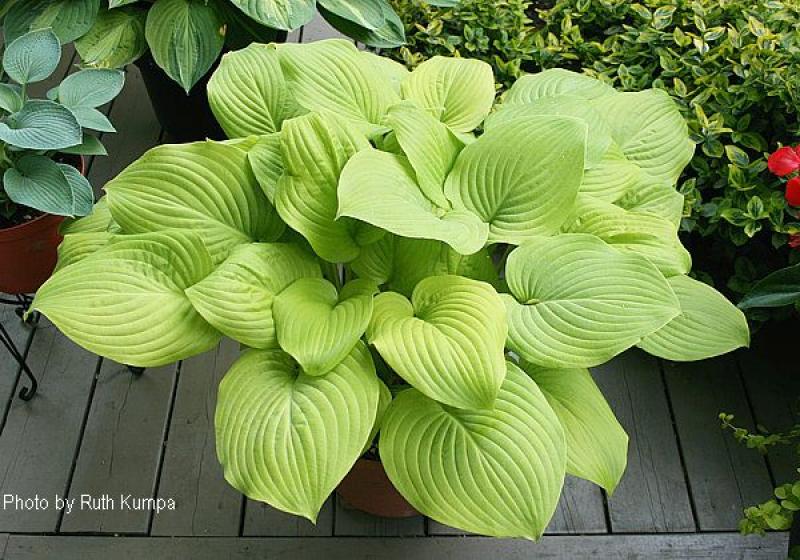 A somewhat shiny, all gold sport of 'Avocado', offering thick substance and fragrant flowers. Fast growth rate to 20” tall and 45” wide. Fragrant lavender flowers in mid summer on scapes 32” high.