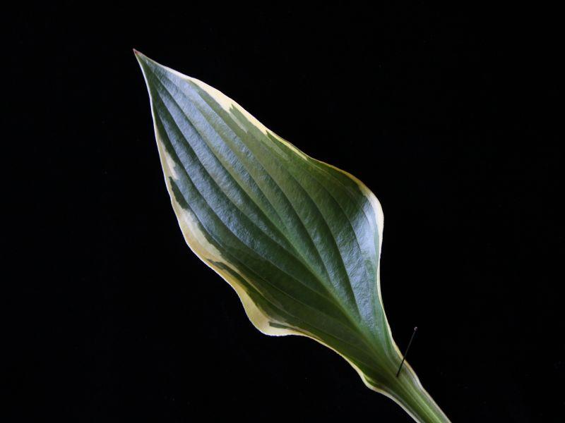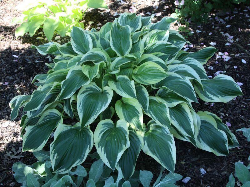 A beautiful, large clump with stunning color contrast of dark green foliage with creamy white margins. A vigorous grower with shiny leaves. Grows 20" tall and 42" wide. Lavender flowers in summer.