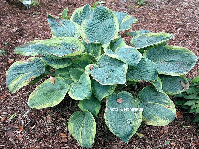 A sieboldiana type hosta with huge, blue-green leaves with yellow margins. It's nearly indistinguishable from 'Frances Williams'. Makes a great specimen, growing 26" tall and 48" wide. Near white flowers in early summer.