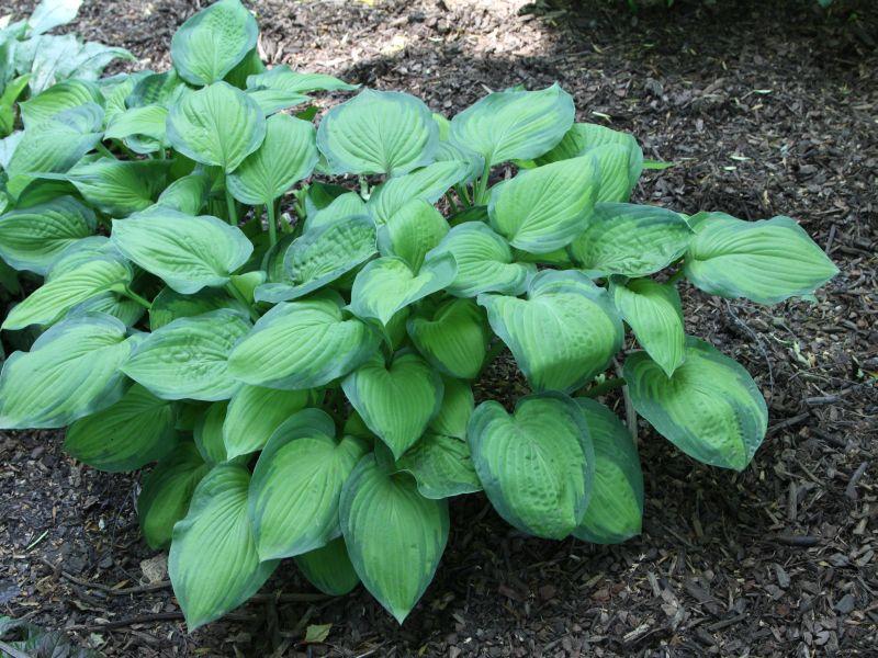 A sport of 'August Moon'. The gold leaves are edged by dramatic, wide, dark green margins. Give it some morning or filtered sun to get the brightest yellow color. Grows 20" tall and 38" wide. Lavender flowers in mid summer.