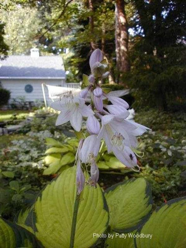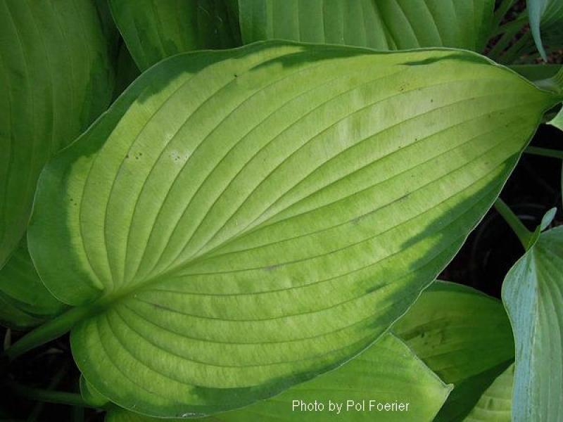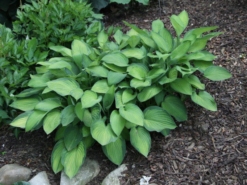 'Gold Standard' has been around a long time, but is still a great choice. The leaves are gold with green margins. The color intensifies as summer progresses. The centers may become almost white if given some morning sun. Grows 20" tall and 32 inches wide. Lavender flowers in mid summer.
