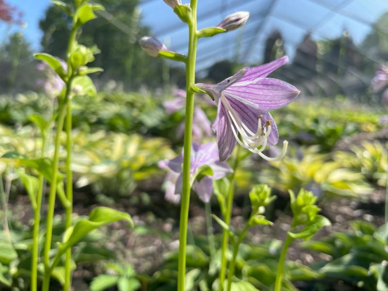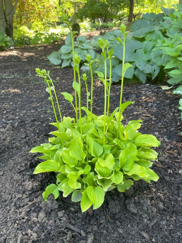 A Fred Smith hybrid offered exclusively by Hornbaker Gardens. Forms a cute, compact clump with heart shaped, chartreuse-yellow leaves that have a bit of waviness on the margins. It's a fast increaser that grows to 10" tall and 16" wide. Lavender flowers in summer.
