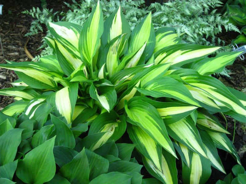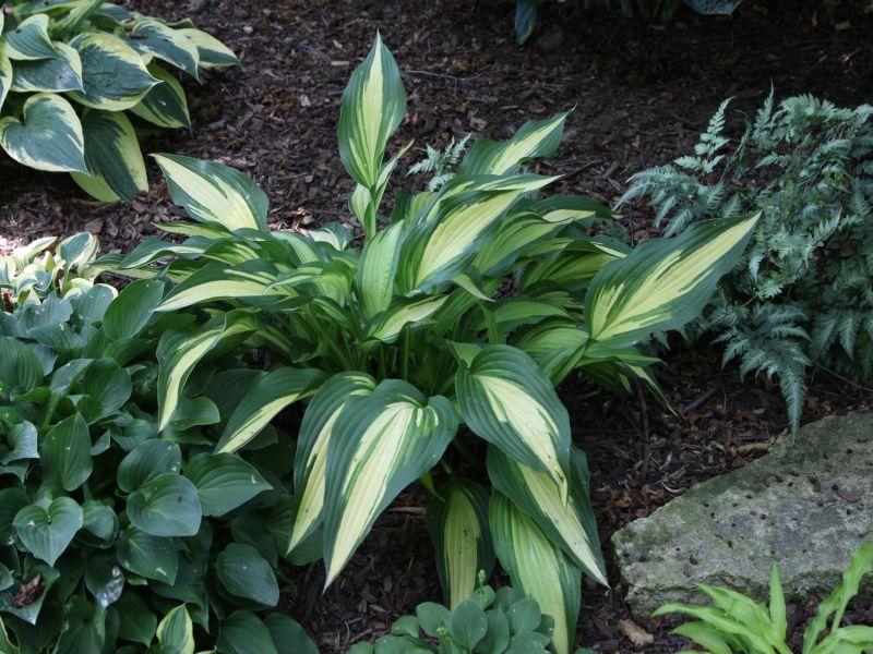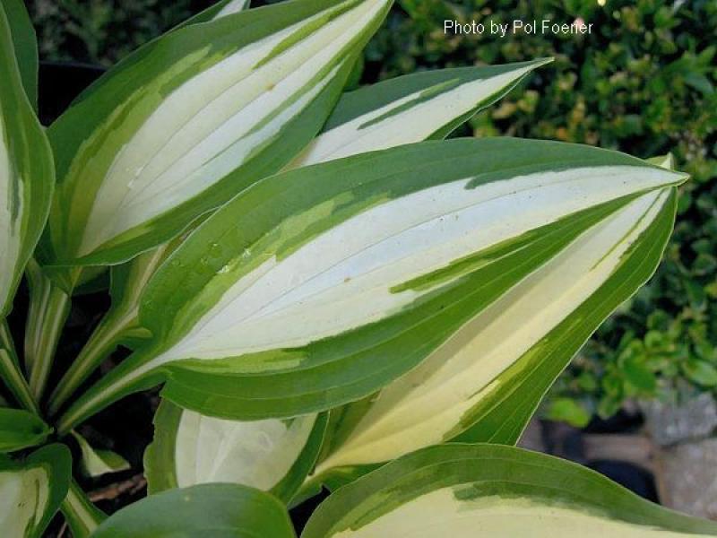 A striking, small clump with narrow, lance-shaped leaves. The leaves are creamy white with lime green margins. Grows 10” tall and 23” wide. Lavender flowers in summer.