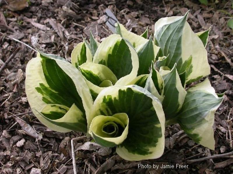 This petite and flirty hosta has very wavy, thick, blue-green leaves with creamy yellow to creamy white margins. The leaves are twisted and turns, forming a most unusual looking, mini clump that grows around 5" tall and 13" wide. Another great addition to the 'Blue Mouse Ears' family of hostas. Lavender flowers with purple stripes appear closely packed together on proportionately sized scapes in early to mid summer.