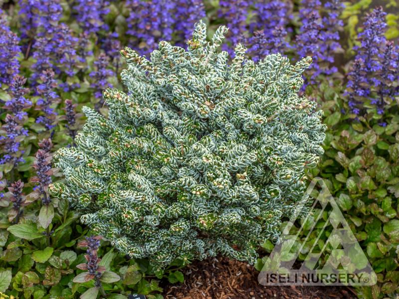 Two-toned needles recurve up and around their stems to expose a bright white, waxy underside of the green needle. Slow growing with a rounded form when young, it may eventually mature into a broadly pyramidal  small tree. This spectacular, colorful dwarf won the distinction of the American Conifer Seciety's 2014 Conifer of the Year. Grows in full sun to part shade. Garden size is 2' tall and 3' wide. Hardy to Zone 4.