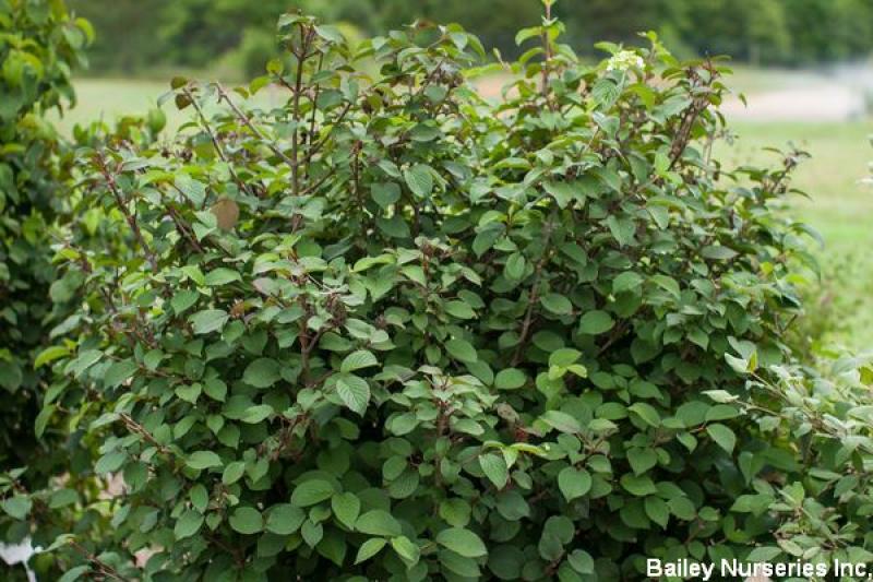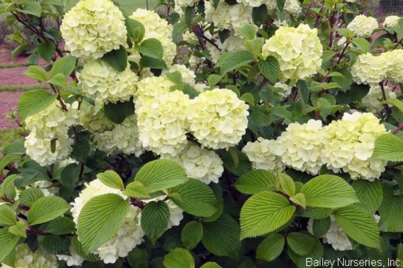 Named because of its early, white baseball-sized flowers, this compact plant has dark green foliage, turning to a rich burgundy in fall. Good in full sun to part shade, it grows 6-8' tall and wide and is hardy to Zone 5.