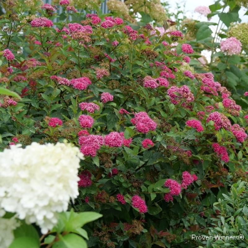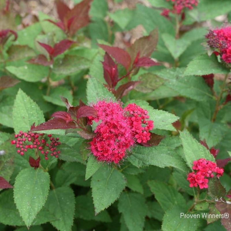 New in 2022. Why another spirea? Because this one blooms all season! Like all the Double Play series, it sports brilliant foliage in the spring, in this case a deep red. After the foliage turns green, the bright purple-red blooms start, and bloom continuously all summer and into the fall. No deadheading required. It’s also deer resistant. Plant in lots of sun. It grows 2-3’ tall and wide, and is hardy to Zone 3.