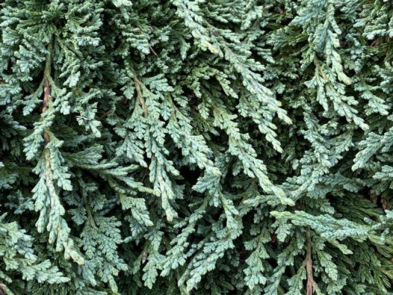 Feathery gray-blue foliage covers the ground, growing flat as a pancake. Branches will root as they creep along the ground. The foliage takes on a light purple hue in winter. It can be staked for more height, forming a hump with a low, spreading skirt all around it. Grows best in sun and well drained soil. Garden size is 6" tall and 4' wide. Hardy to Zone 3.
