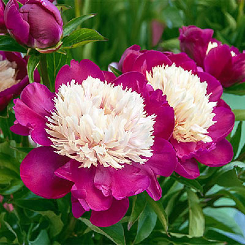 (Garden Peony) bright, beetroot-colored petals surround a snowy white center; 32-34 inches tall; full to part sun; Zone 3