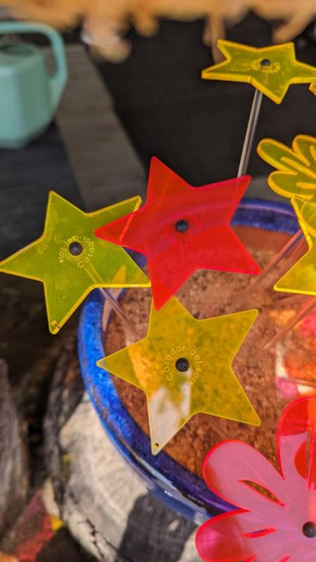 Flat, yellow, star-shaped suncatcher. 3.2" flower on a 10" clear stem.
