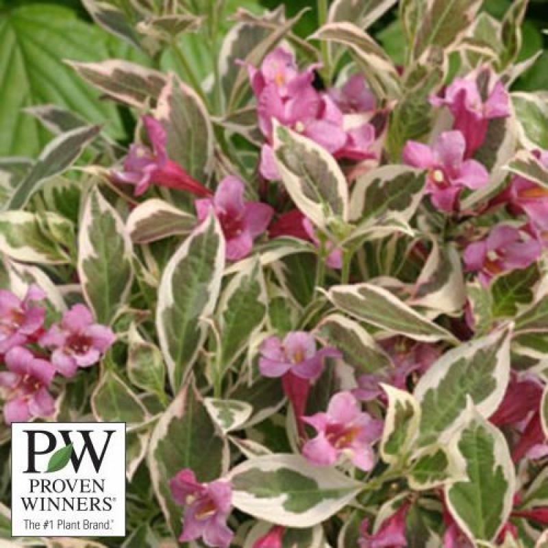 My Monet Purple Effect® produces a burst of rich, pink flowers in spring, followed by attractive green, cream and purple (as opposed to pink) foliage on a tidy mound.  Pruning is rarely needed, but prune out any occasional shoot that reverts to all green. Purple effect® has more flowers, better adaptability and is slightly larger than My Monet®. It will handle full sun, but may burn around the edges in late summer if it's not irrigated. Afternoon shade is best, where it will grow 2-3' tall and wide. Hardy to Zone 4.