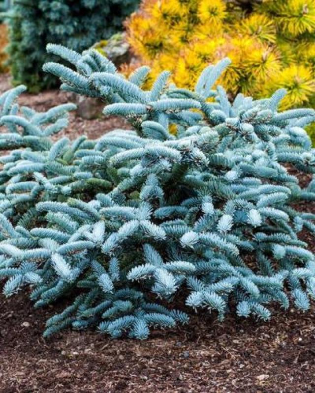 This steel blue cultivarient of the Noble Fir grows slowly and will develop one or two leaders with age. Prune leaders out in order to keep it in its prostrate form. In 10 years, it will grow approximately 3' ft. tall, 6' wide and will slowly become taller and wider with age. Its needles are soft to the touch and its color is soft on the eyes. The form and the color add intrigue and a calm to any garden. Like most firs, it prefers rich soil with good drainage and does not tolerate drought conditions well. If you keep an eye on soil moisture during the dry months and are willing to prune out a leader or two from time to time, this conifer will continue to impress with its bright blue color and its unique form. Prefers full sun and is hardy to Zone 5.